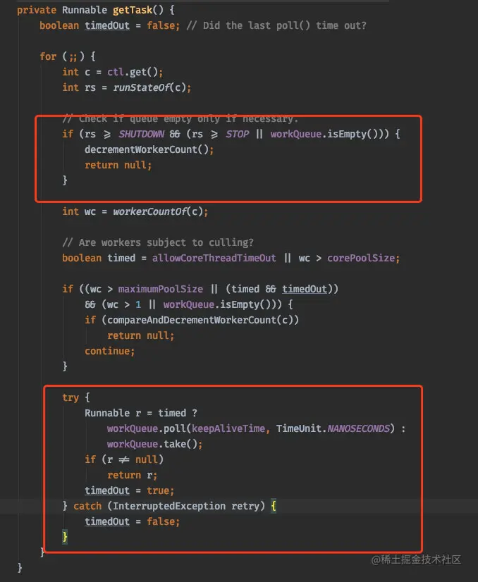 还有就是当 getTask 方法返回为 null 的时候也会结束循环