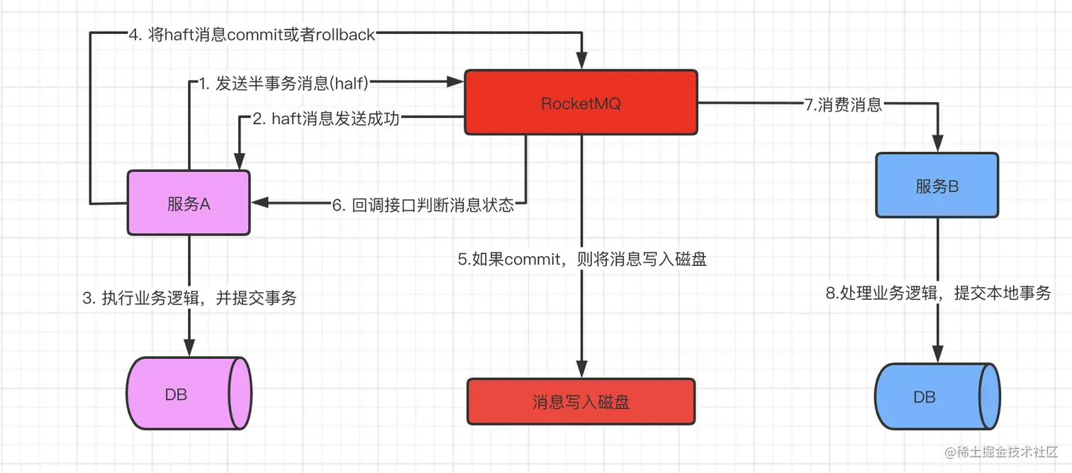 如果 MQ 长时间没有接收到 commit 或者 rollback 消息,例如:服务 A 在处理本地业务时宕机了,或者发送的 commit、rollback 因为在弱网环境,数据丢失了。那么 MQ 就会在一定时间后尝试调用服务 A 提供的一个接口,通过这个接口来判断 half 消息的状态。所以服务 A 提供的接口,需要实现的业务逻辑是:通过数据库中对应数据的状态来判断,之前的 half 消息对应的业务是否执行成功。如果 MQ 从这个接口中得知 half 消息执行成功了,那么 MQ 就会将 half 消息持久化到本地磁盘,如果得知没有执行成功,那么就会将 half 消息删除。