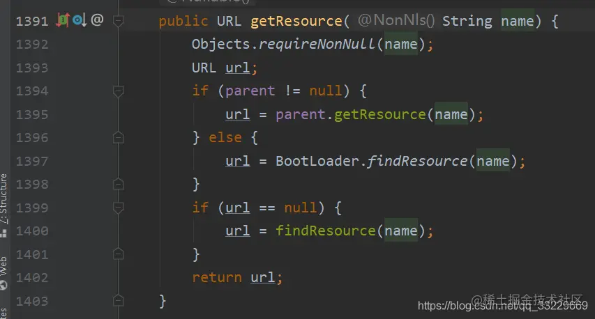 ClassLoader 对象的源码中, 有getResource方法如下: