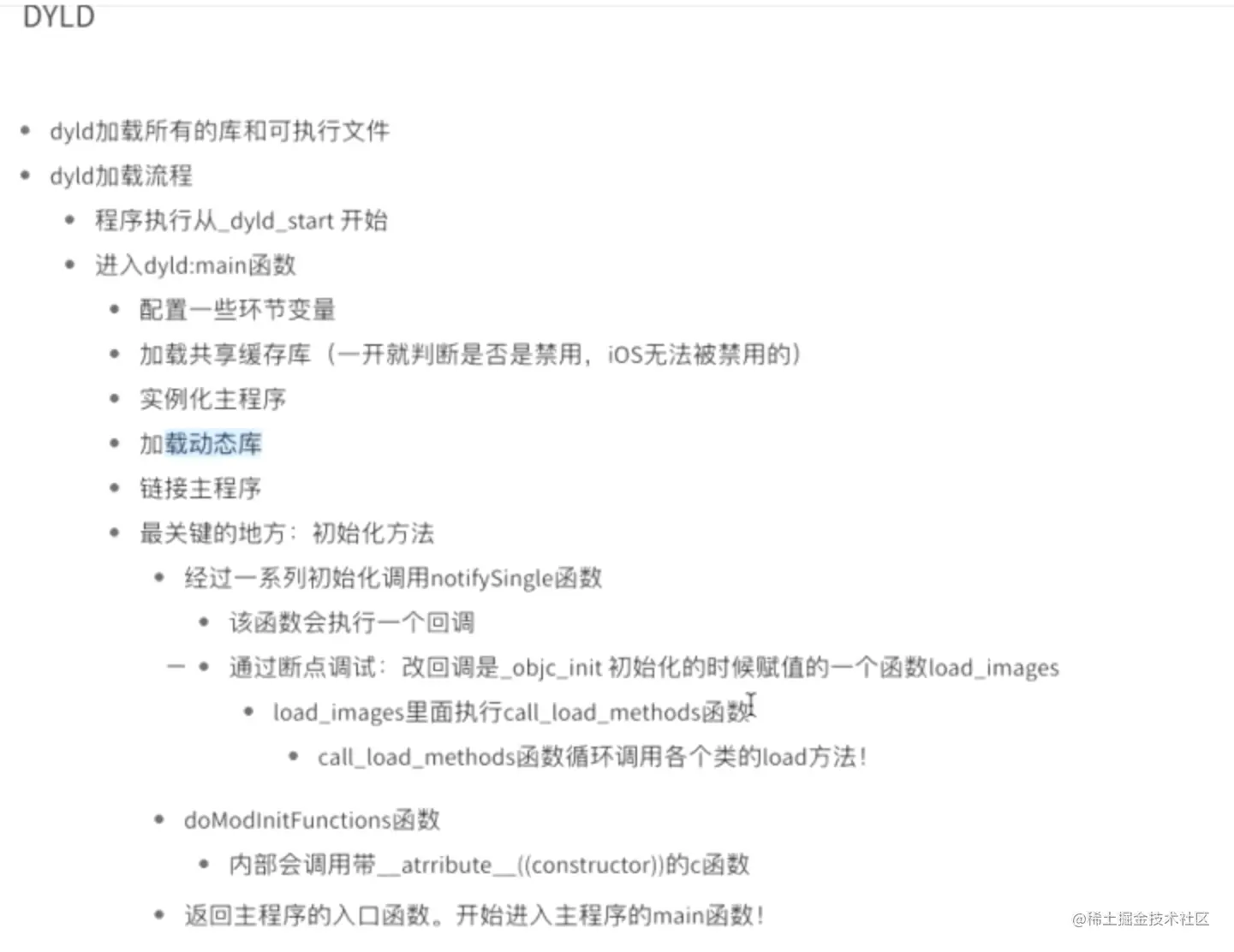 上述就是 App 启动的时候 dyld 工作的流程,也能看到 dyld 和 Object-C runtime 链接的方式。
