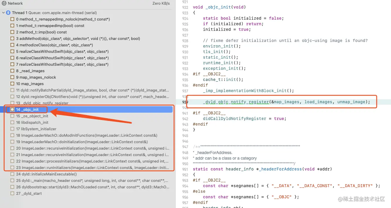 这里,终于找到了 _objc_init 的调用方法,完美的和调用栈匹配。