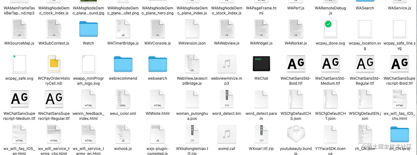 拆包之后,发现就是一些资源(包括:图片,json文件,html本地文件等)和一个显示 exec 的黑色文件,这个黑色文件就是代码打包后的东西,也就是 Mach-O 文件。