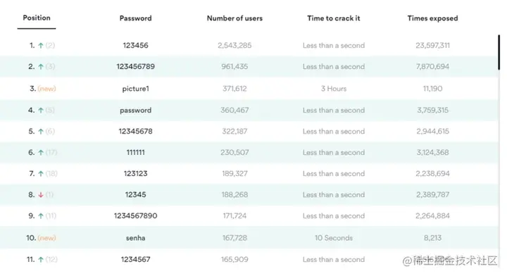 在 2020 年末,NordPass 公布了 2020 年使用率最高的 200 个密码,排名靠前的几个密码分别为 123456、123456789、password、12345678、111111、123123、12345、1234567890、1234567、000000、1234 …… 除了纯数字,还有各种数字和字母组合,例如:qwerty、abc123 和 picture1 等等。