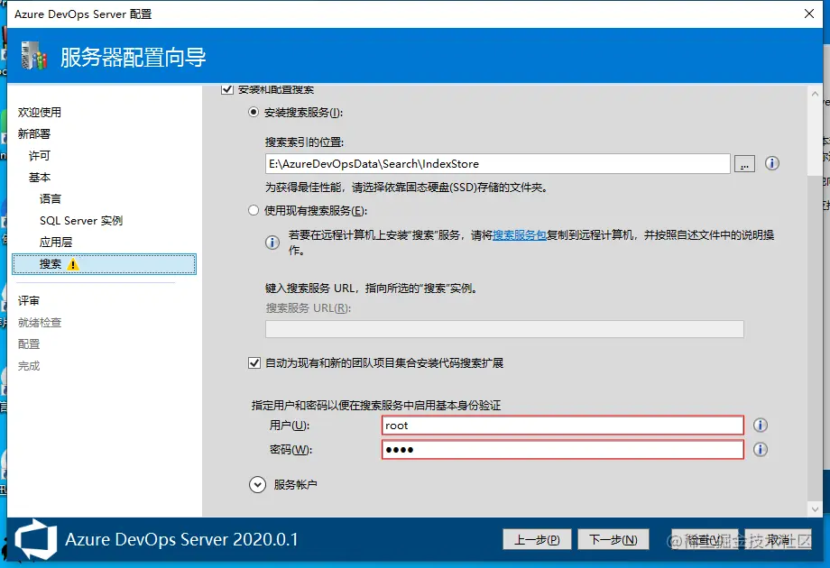 9、配置搜索服务的用户名和密码,这里对用户名和密码有长度要求。