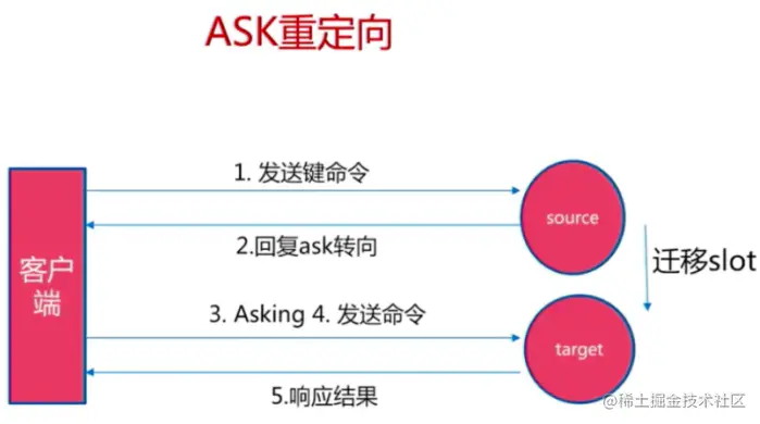 - 客户端向新的节点发送Asking命令给新的节点,然后再次向新节点发送命令