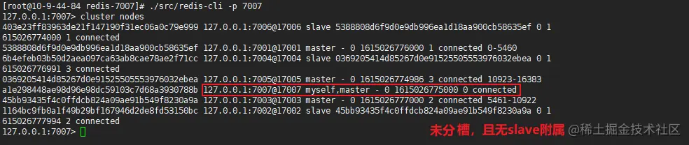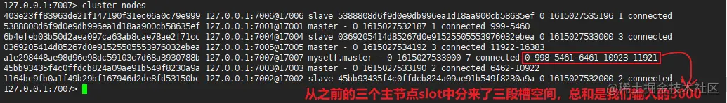 ./redis-cli --cluster add-node 127.0.0.1:7007 127.0.0.1:7001 - 登录任一客户端后,查看当前集群节点分配信息