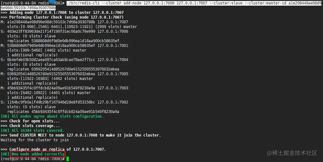 ./src/redis-cli --cluster add-node 127.0.0.1:7008 127.0.0.1:7007 --cluster-slave --cluster-master-id a1e298448ae98d96e98dc59103c7d68a3930788b - 登录任一reids客户端,查看集群中的结点
