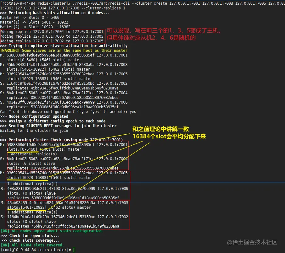 进入任一端口(此处示例进入7001)的redis执行以下命令:./redis-7001/src/redis-cli --cluster create 127.0.0.1:7001 127.0.0.1:7003 127.0.0.1:7005 127.0.0.1:7002 127.0.0.1:7004 127.0.0.1:7006 --cluster-replicas 1 # 命令的语义为:创建集群,按 '1' 为对应关系进行配置 ==> 一共有6个host地址,1对1表明 前三个为主、后三个为从