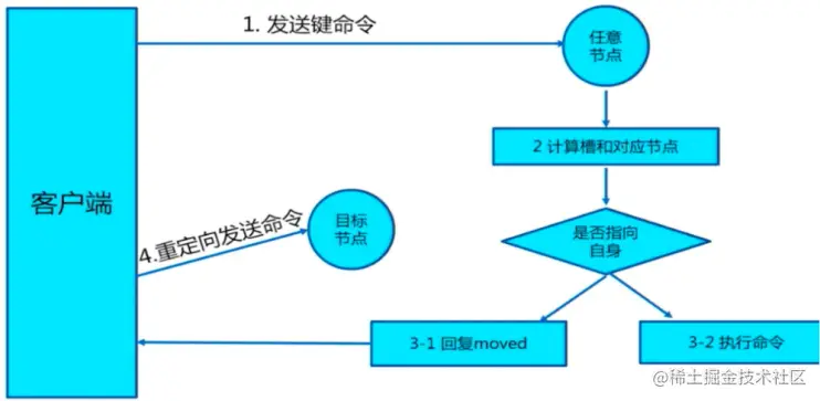 - 客户端向Redis Cluster的任意节点发送命令,接收命令的节点会根据CRC16规则进行hash运算与16384取余,计算自己的槽和对应节点