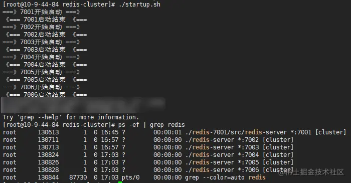 start.sh一次性启动6个redis实例:并使用echo "===》7001开始启动 ===》" cd redis-7001/src/ ./redis-server ../redis.conf echo "《=== 7001启动结束 《===" echo "===》7002开始启动 ===》" cd ../../ cd redis-7002/src/ ./redis-server ../redis.conf echo "《=== 7002启动结束 《===" echo "===》7003开始启动 ===》" cd ../../ cd redis-7003/src/ ./redis-server ../redis.conf echo "《=== 7003启动结束 《===" echo "===》7004开始启动 ===》" cd ../../ cd redis-7004/src/ ./redis-server ../redis.conf echo "《=== 7004启动结束 《===" echo "===》7005开始启动 ===》" cd ../../ cd redis-7005/src/ ./redis-server ../redis.conf echo "《=== 7005启动结束 《===" echo "===》7006开始启动 ===》" cd ../../ cd redis-7006/src/ ./redis-server ../redis.conf echo "《=== 7006启动结束 《==="chmod u+x start.sh赋写和执行的权限 - 启动并检查线程: