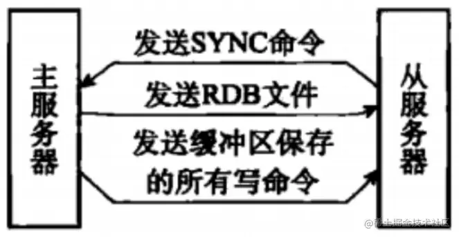 RDB文件并发送给从服务器,同时发送保存所有写命令给从服务器 - 从服务器清空之前数据并执行解释