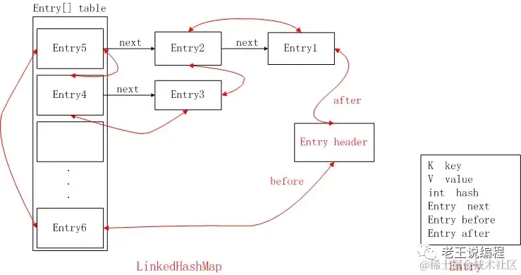 这张图展示的是 LinkedHashMap 的数据结构图,和 HashMap 不同的是,它的链表里面的数据元素存储是有序的。其中最大的不同就是 LinkedHashMap 是一个双向链表,如果在使用时数据结构比较复杂(比如:一层又包含着一层的数据对象)、要求效率比较高的话,最好使用 LinkedHashMap,可以使用下面代码解决 LinkedHashMap 线程不同步的问题。