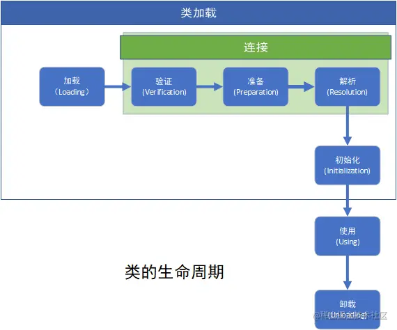 秉持着没图没真相、开篇必放图的原则,(Class文件结构都是定义的内容比较枯燥)我们先聊一聊类加载,再聊Class文件结构。我们按照生命周期图分部介绍。