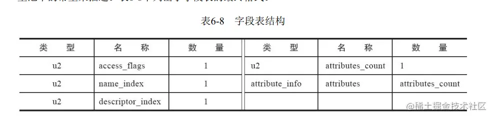 字段表(field_info) 用于描述接口或者类中声明的变量。 Java语言中的“字段”(Field) 包括类级变 量以及实例级变量, 但不包括在方法内部声明的局部变量。 读者可以回忆一下在Java语言中描述一个 字段可以包含哪些信息。 字段可以包括的修饰符有字段的作用域(public、 private、 protected修饰 符) 、 是实例变量还是类变量(static修饰符) 、 可变性(final) 、 并发可见性(volatile修饰符, 是否 强制从主内存读写) 、 可否被序列化(transient修饰符) 、 字段数据类型(基本类型、 对象、 数组) 、 字段名称。 上述这些信息中, 各个修饰符都是布尔值, 要么有某个修饰符, 要么没有, 很适合使用标 志位来表示。 而字段叫做什么名字、 字段被定义为什么数据类型, 这些都是无法固定的, 只能引用常 量池中的常量来描述。