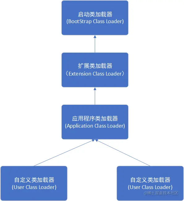 先检查请求加载的类型是否已经被加载过, 若没有则调用父加载器的 loadClass()方法, 若父加载器为空则默认使用启动类加载器作为父加载器。 假如父类加载器加载失败, 抛出ClassNotFoundException异常的话, 才调用自己的findClass()方法尝试进行加载。