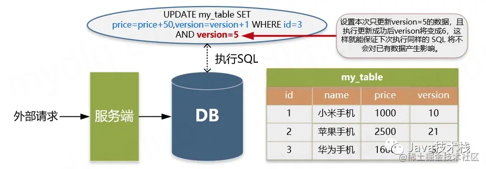 上面 WHERE 后面跟着条件 id=1 AND version=5 被执行后,id=1 的 version 被更新为 6,所以如果重复执行该条 SQL 语句将不生效,因为 id=1 AND version=5 的数据已经不存在,这样就能保住更新的幂等,多次更新对结果不会产生影响。
