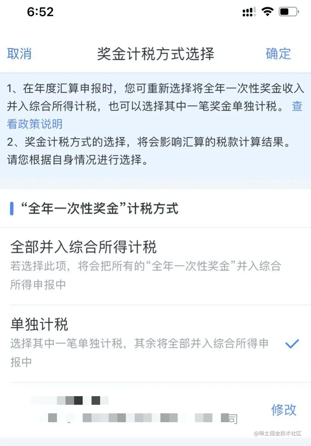 个税APP貌似是会帮你选择最优的计税方式,单独计税还更划算,至于年终奖怎么算,T度是什么,网上都能搜到,我就不在这里赘述了。