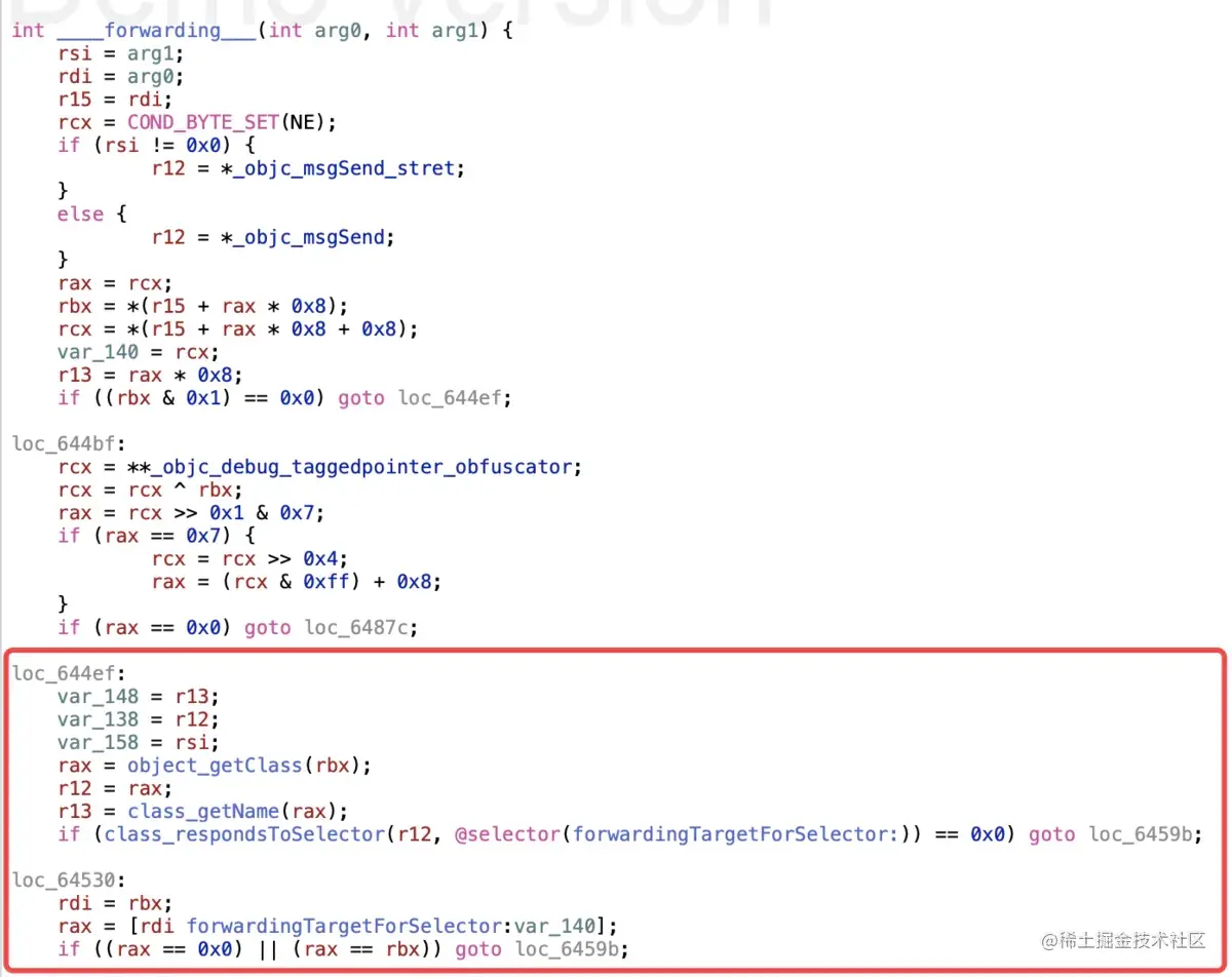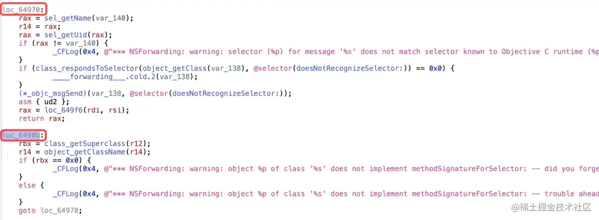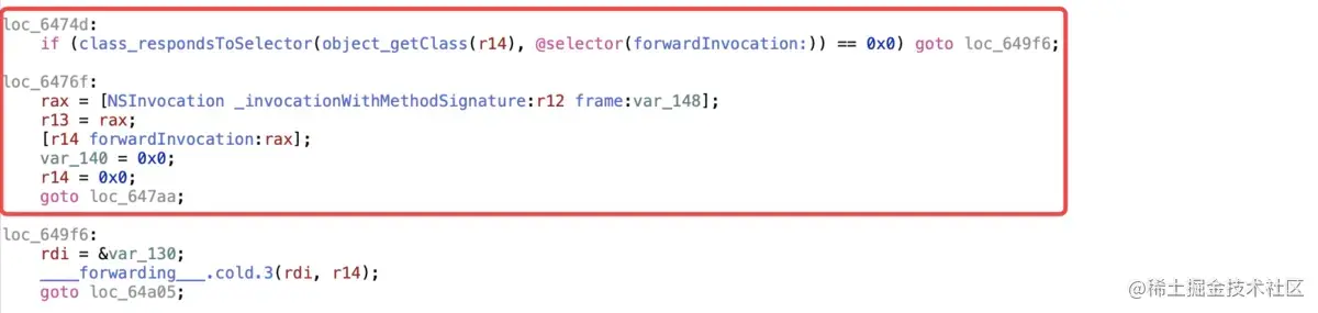 ___forwarding___的伪代码实现,首先是查看是否实现forwardingTargetForSelector方法,如果没有响应,跳转至loc_6459b即快速转发没有响应,进入慢速转发流程 -