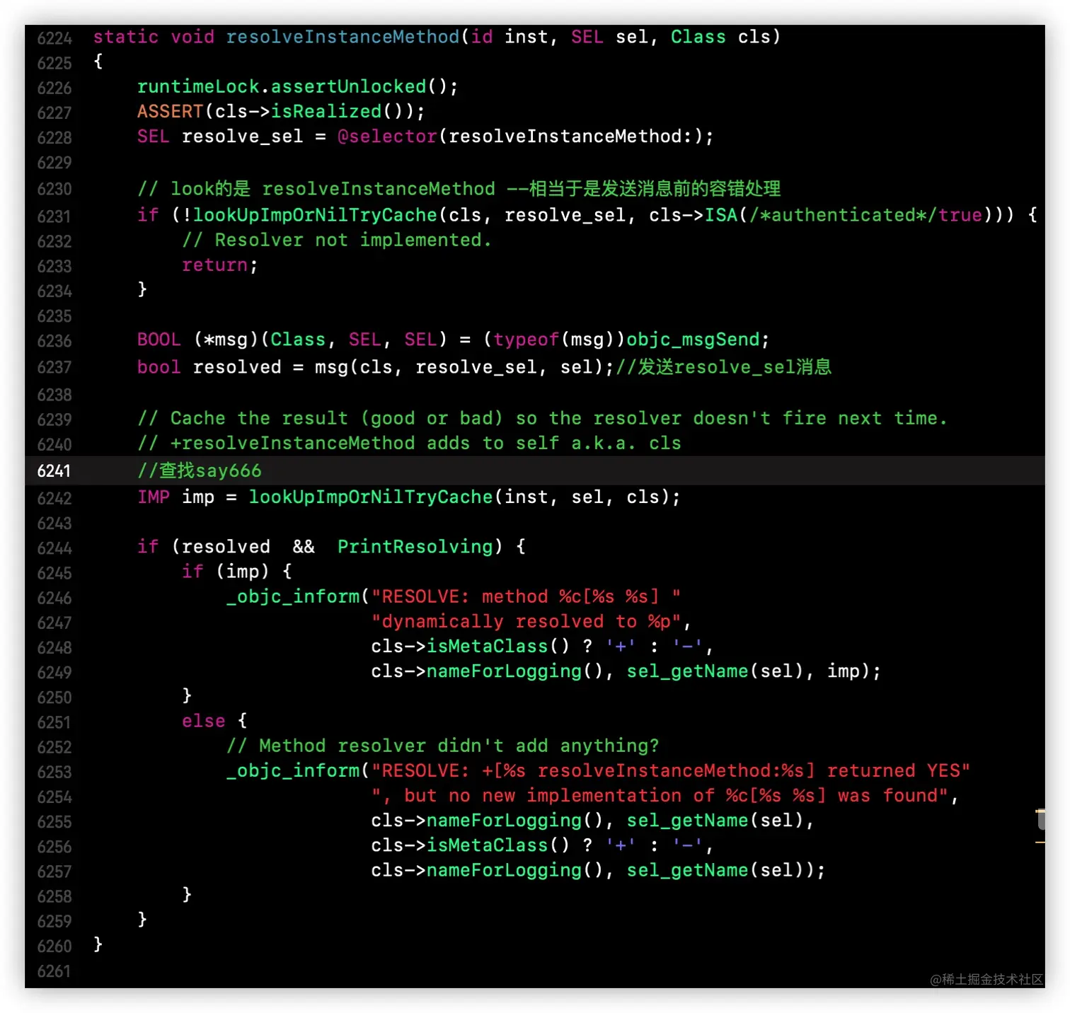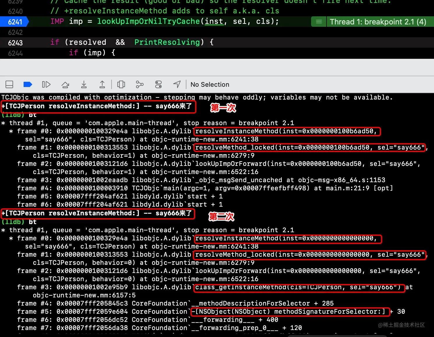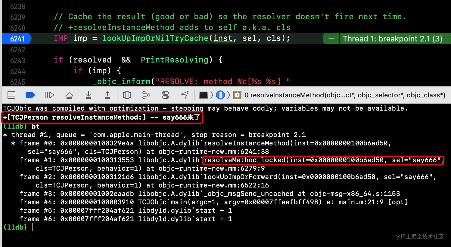resolveInstanceMethod方法中IMP imp = lookUpImpOrNil(inst, sel, cls);处加一个断点,运行程序,直到第一次“来了”,通过bt查看第一次动态方法决议的堆栈信息,此时的sel是say666 -