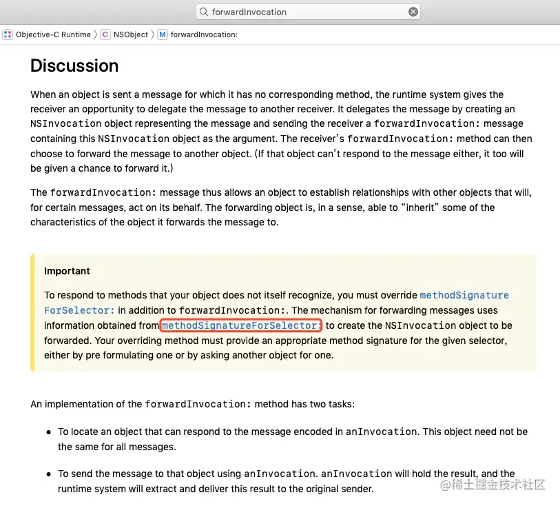 forwardingTargetForSelector在源码中只有一个声明,并没有其它描述,好在帮助文档中提到了关于它的解释:
