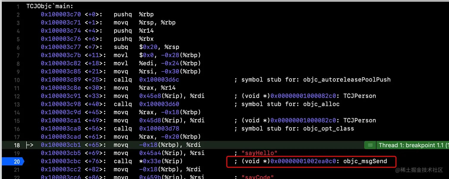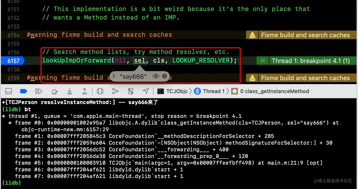 这一点可以通过代码调试来验证,如下所示,在class_getInstanceMethod方法处加一个断点,在执行了methodSignatureForSelector方法后,返回了签名,说明方法签名是生效的,苹果在走到invocation之前,给了开发者一次机会再去查询,所以走到class_getInstanceMethod这里,又去走了一遍方法查询say666,然后会再次走到动态方法决议