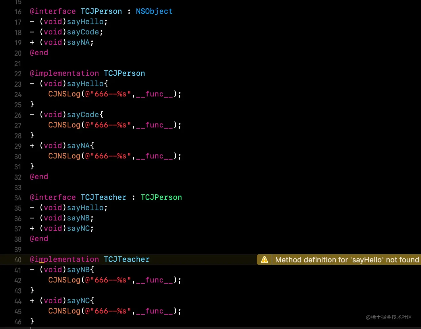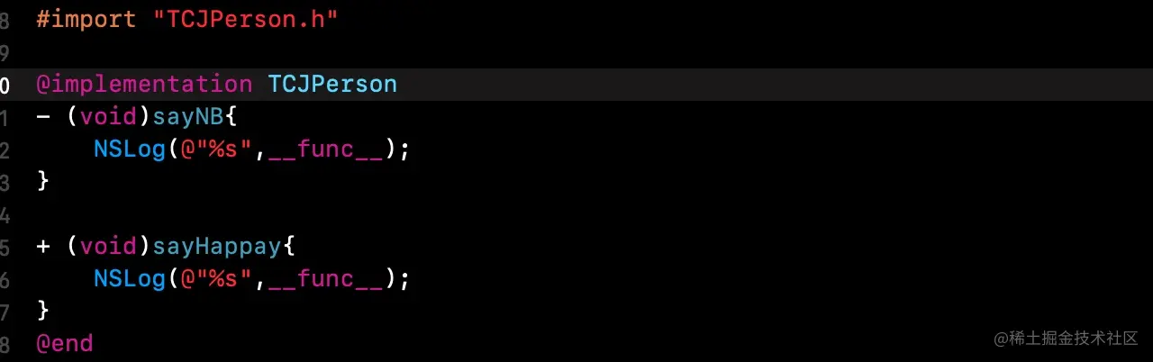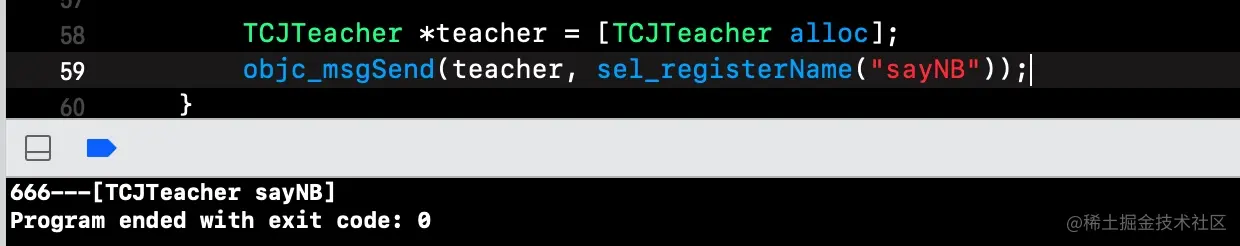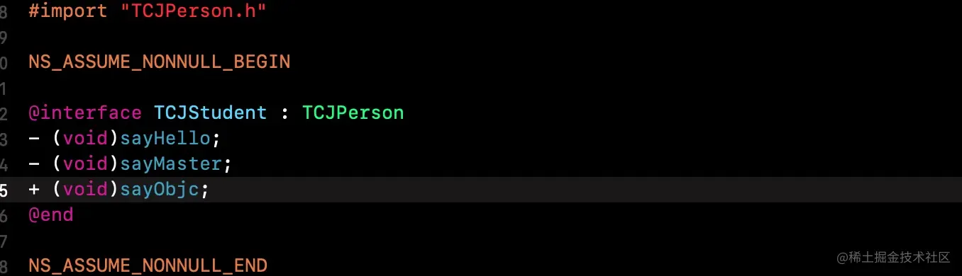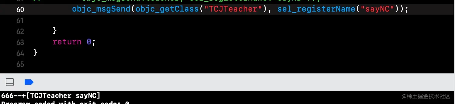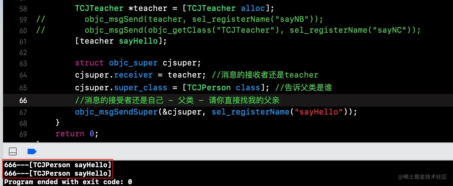 注意前面的细节:父类TCJPerson中实现了sayHello方法,而子类TCJTeacher没有实现sayHello方法.现在我们可以尝试让teacher调用sayHello执行父类中实现,通过objc_msgSendSuper实现.