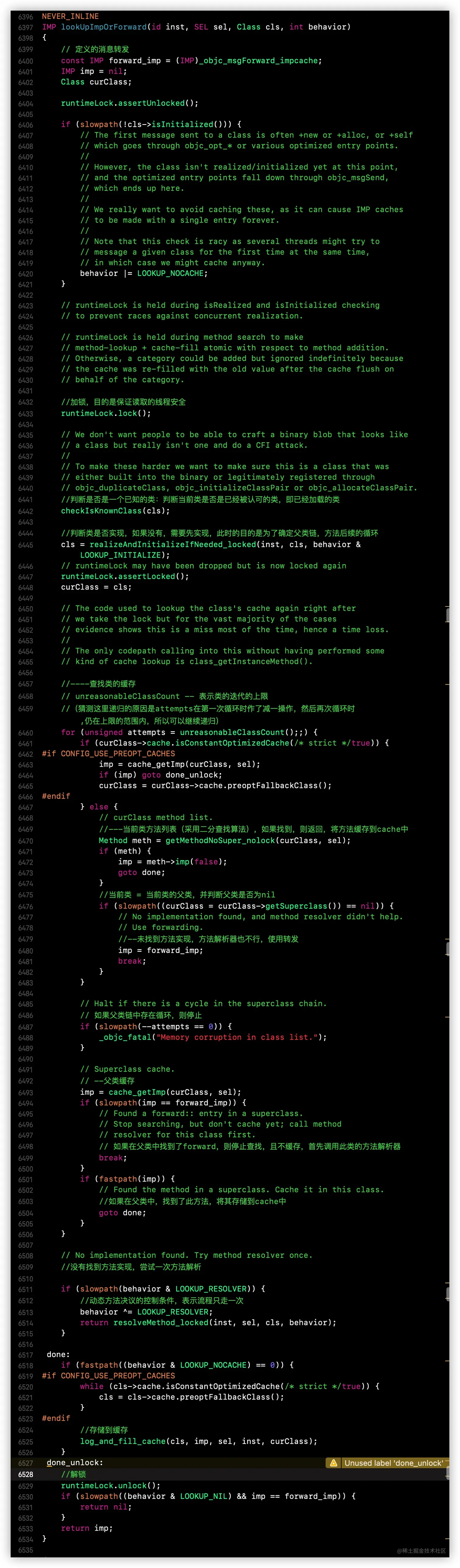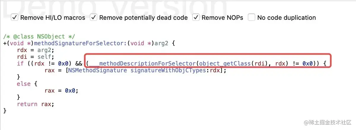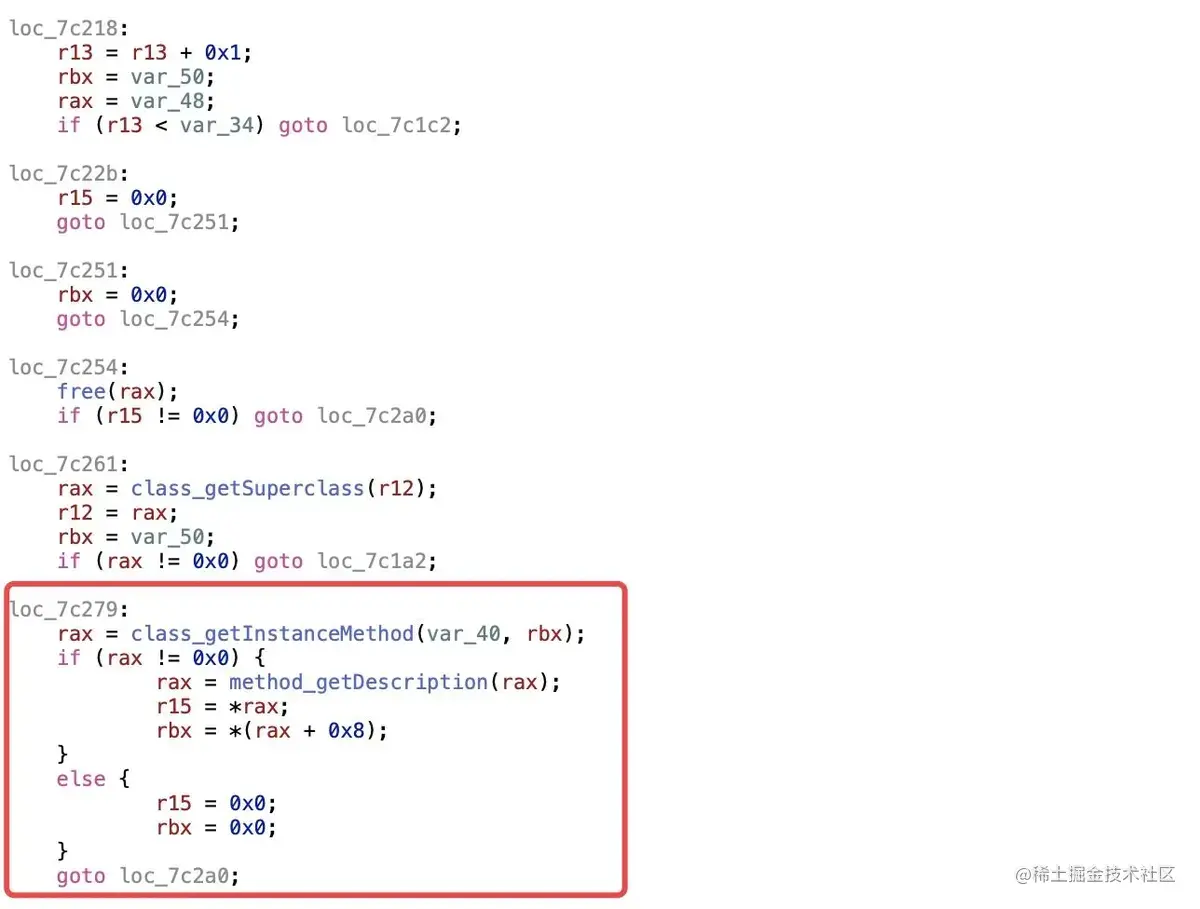 ___methodDescriptionForSelector的伪代码实现,结合汇编的堆栈打印,可以看到,在___methodDescriptionForSelector这个方法中调用了objc4源码的class_getInstanceMethod -