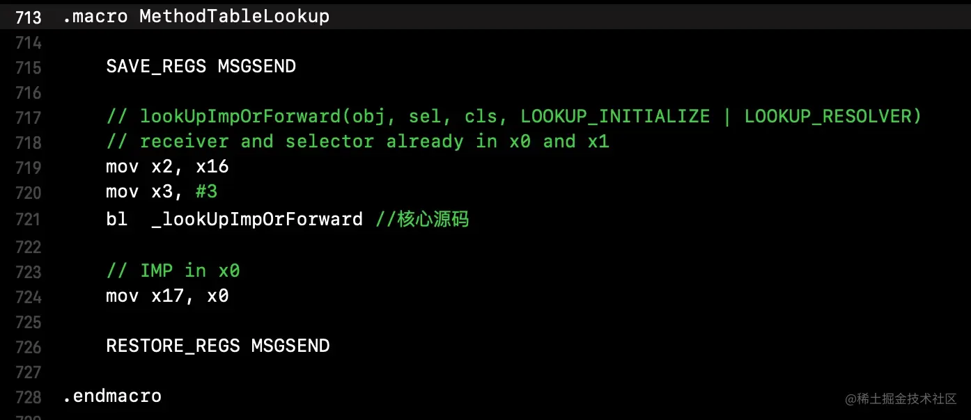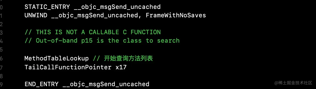objc-msg-arm64.s文件中查找__objc_msgSend_uncached的汇编实现,其中的核心是MethodTableLookup(即查询方法列表),其源码如下 -