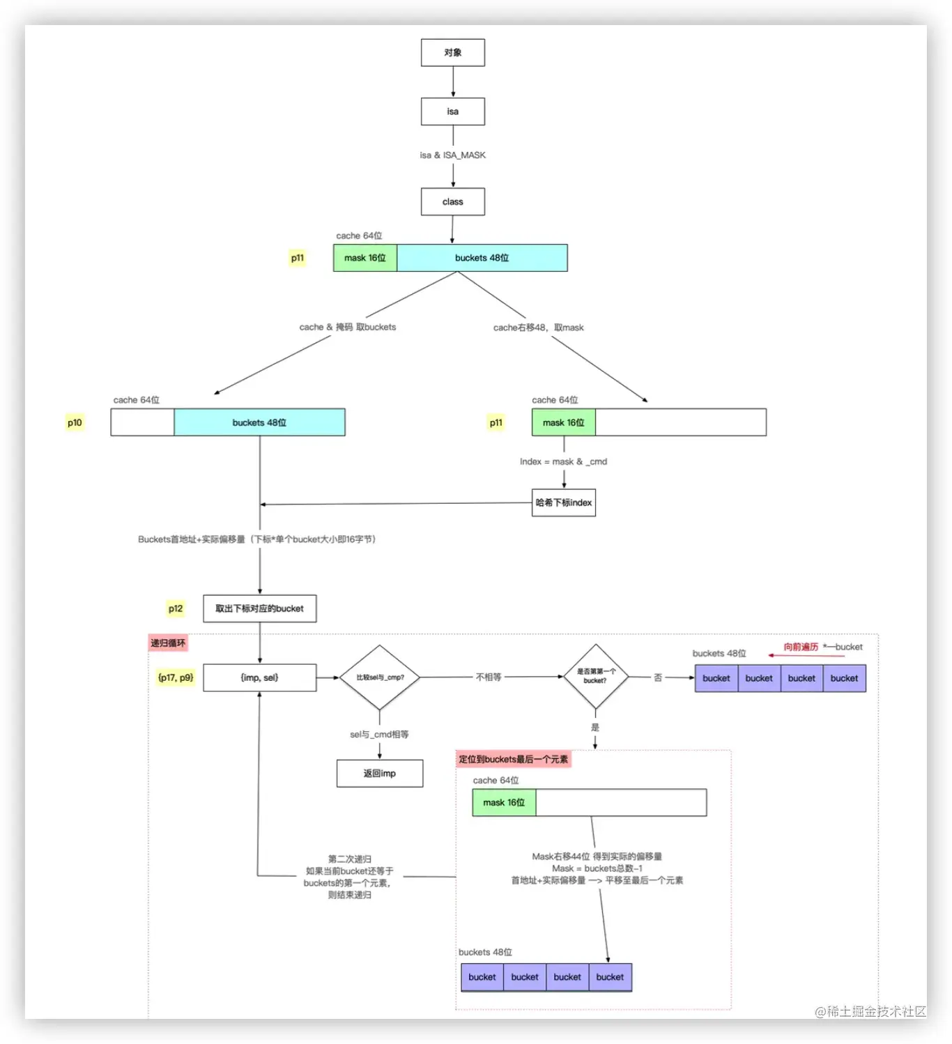 objc_msgSend的参数p1(即第二个参数_cmd)& msak,通过哈希算法,得到需要查找存储sel-imp的bucket下标index,即p12 = index = _cmd & mask,为什么通过这种方式呢?因为在存储sel-imp时,也是通过同样哈希算法计算哈希下标进行存储,所以读取也需要通过同样的方式读取,如下所示