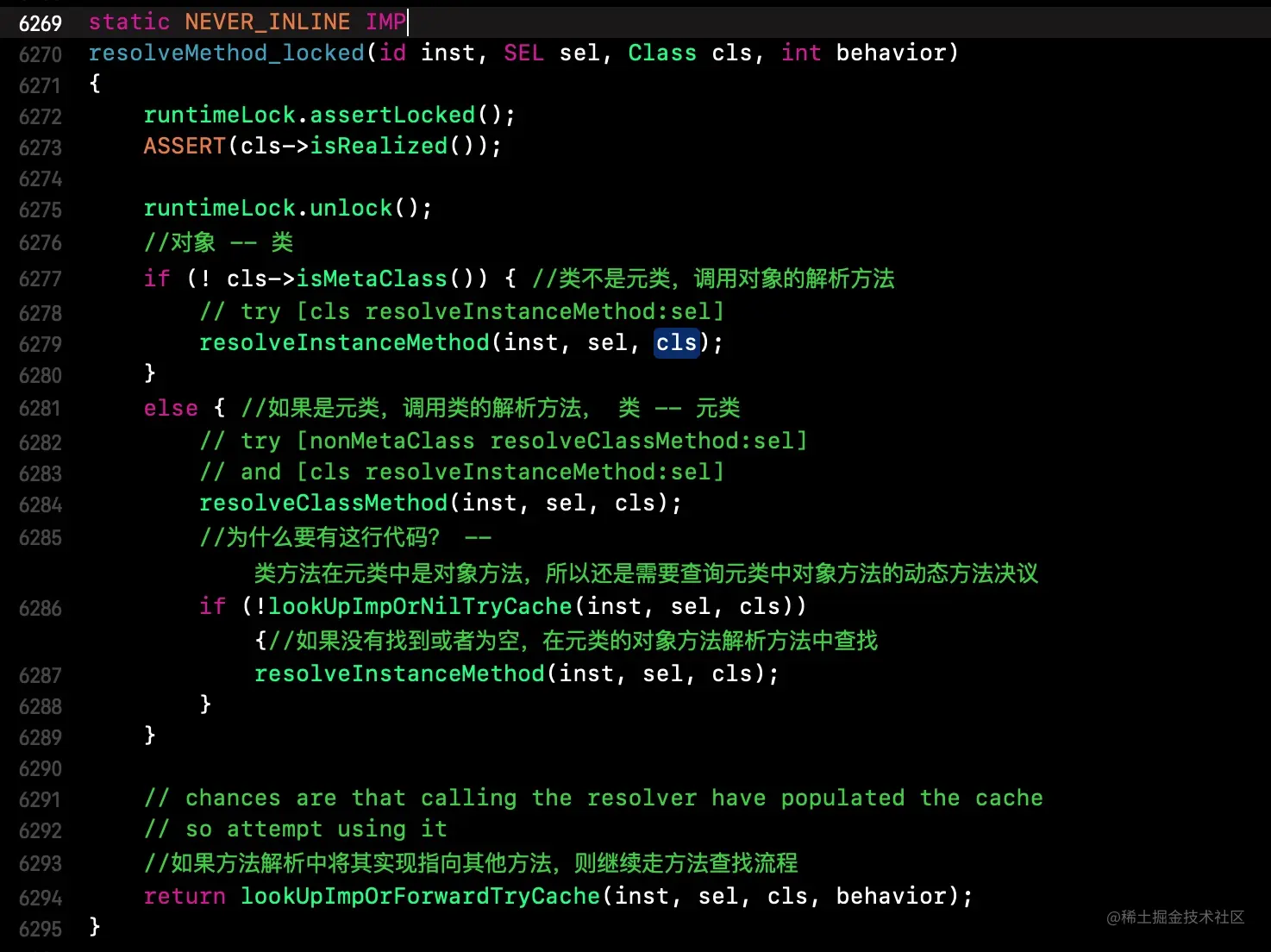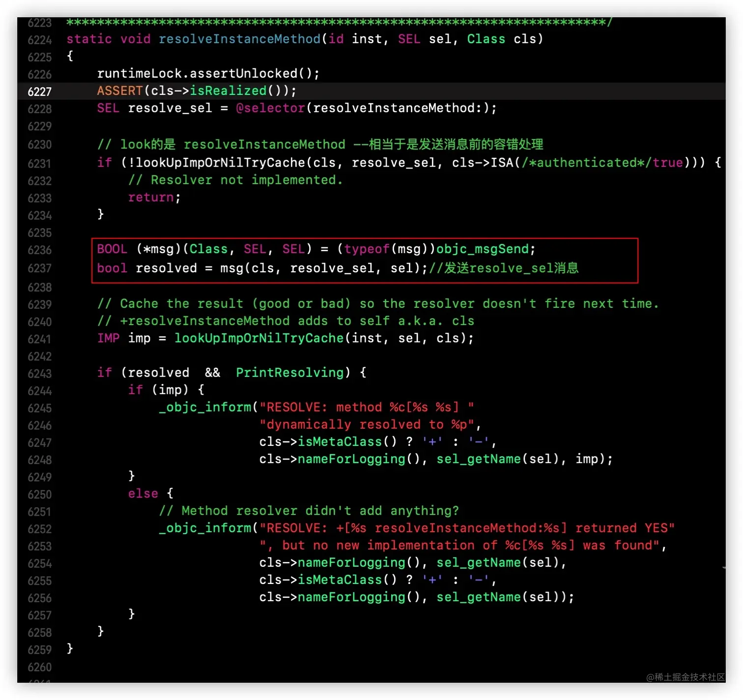 在慢速查找流程中,我们了解到resolveInstanceMethod方法的执行是通过lookUpImpOrForward --> resolveMethod_locked --> resolveInstanceMethod来到resolveInstanceMethod源码,在源码中通过发送resolve_sel消息触发,如下所示