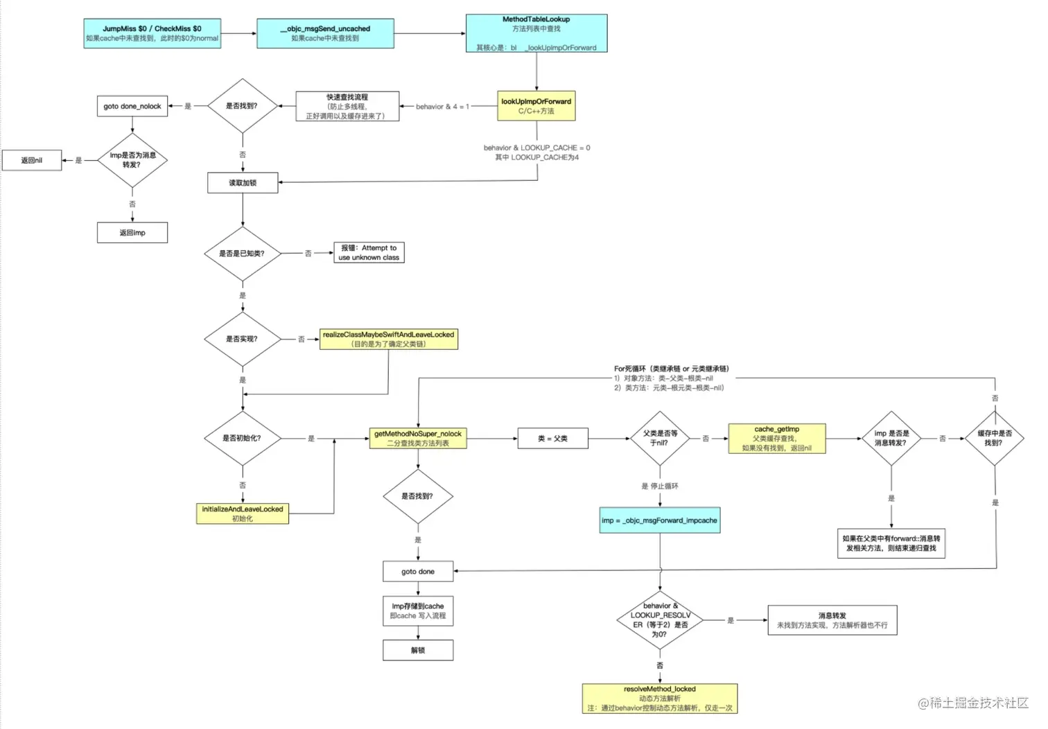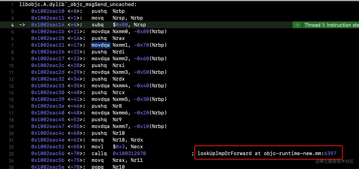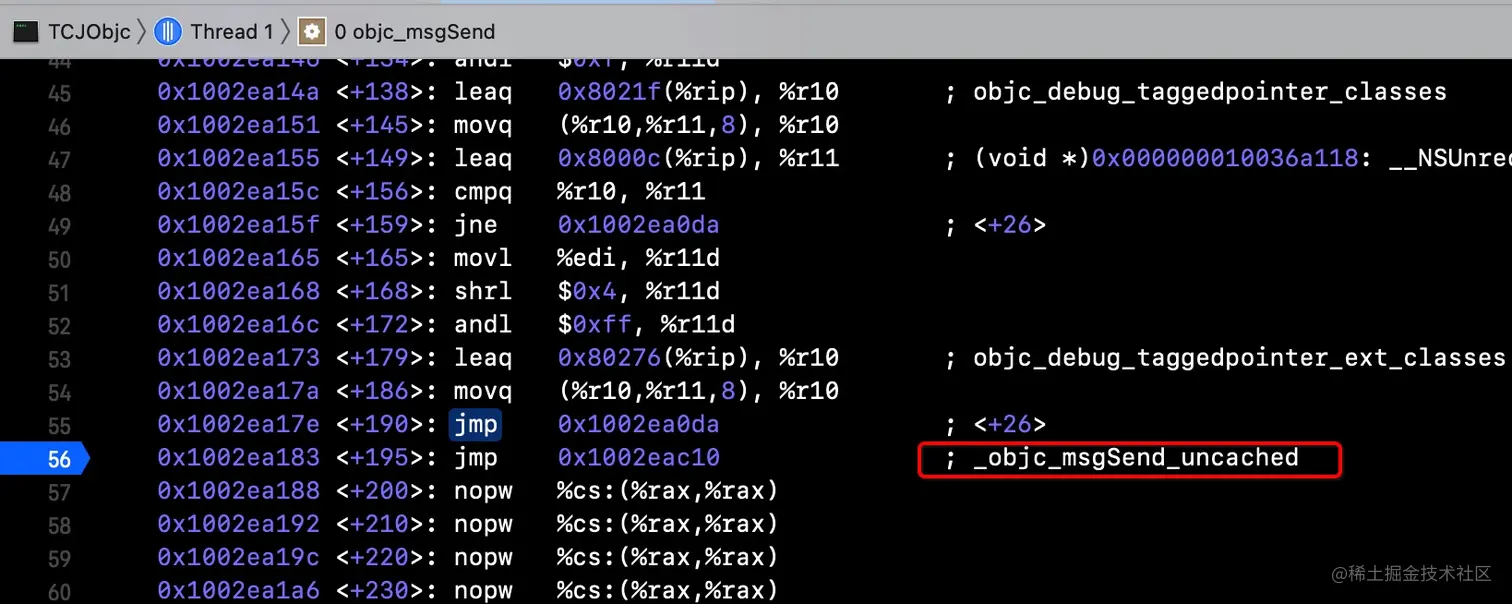 CheckMiss,因为$0是normal,会跳转至__objc_msgSend_uncached,即进入慢速查找流程 - 如果根据