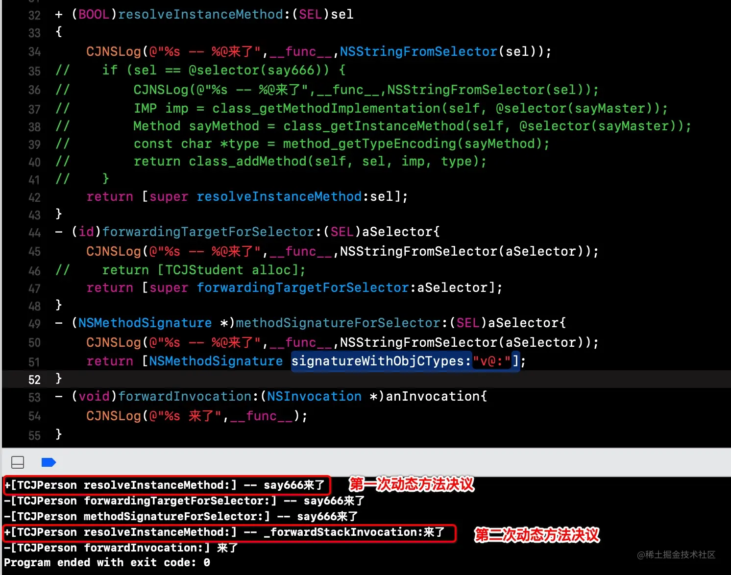 TCJPerson类中重写methodSignatureForSelector和forwardInvocation,运行结果发现第二次动态方法决议在