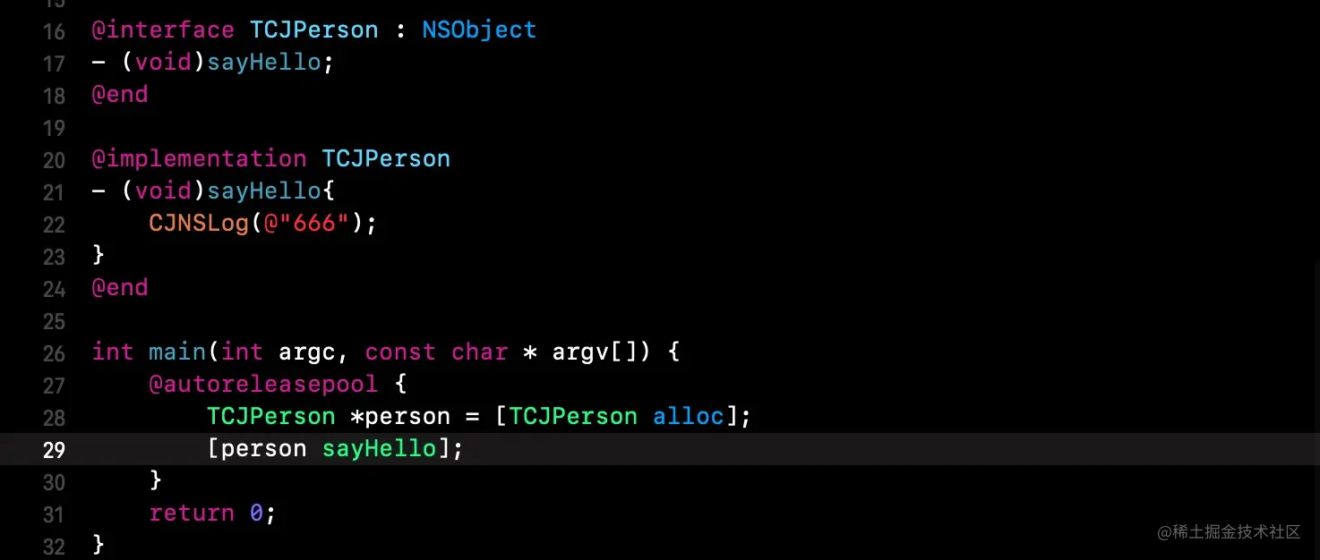 注意:如果外部定义了C函数并调用如void sayHello() {},在clang编译之后还是sayHello()而不是通过objc_msgSend去调用.因为发送消息就是找函数实现的过程,而C函数可以通过函数名——指针就可以找到.