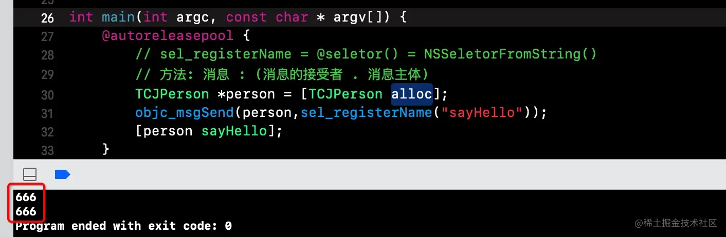 ((TCJPerson *(*)(id, SEL))(void *)是类型强转(id)objc_getClass("TCJPerson")获取TCJPerson类对象sel_registerName("alloc")等同于@selector()