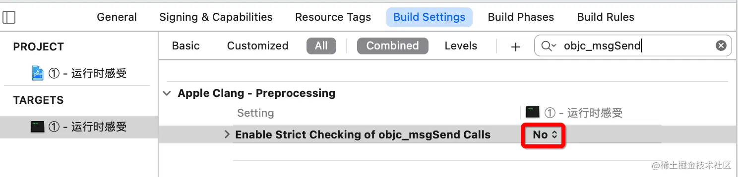 target --> Build Setting -->搜索msg -- 将enable strict checking of obc_msgSend calls由YES 改为NO,将严厉的检查机制关掉,否则objc_msgSend的参数会报错