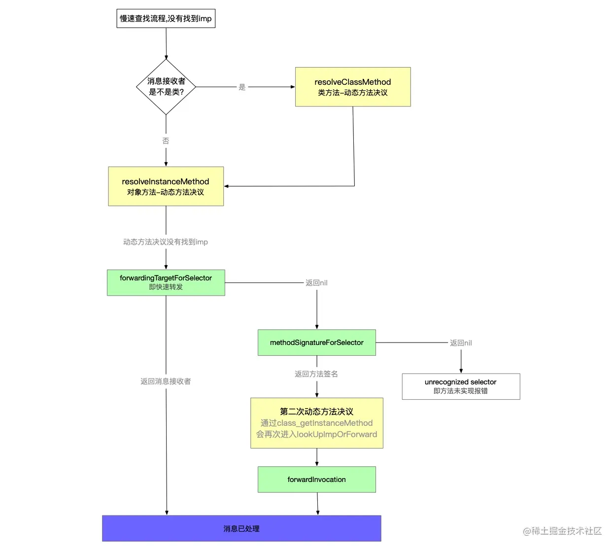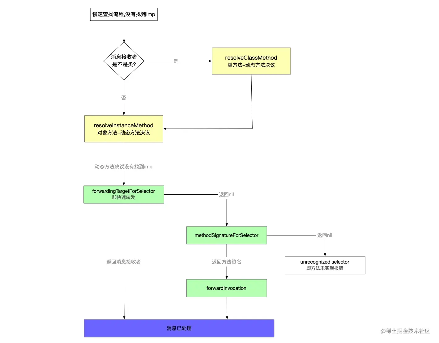 消息接收者,在消息接收者中还是没有找到方法实现,则进入另一个方法的查找流程 - 如果返回nil,则进入慢速消息转发