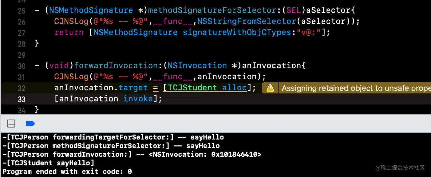 forwardInvocation和methodSignatureForSelector必须是同时存在的,底层会通过方法签名,生成一个NSInvocation,将其作为参数传递调用- 查找可以响应