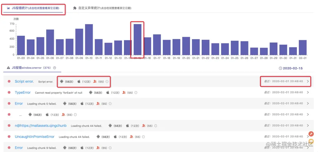 通过分类聚合,我们需要统计出每天js报错的数量,你的项目有没有异常,一目了然。通过点击不同的柱子(选择不同的日期),展现出某一天的js error分类聚合的结果。帮助我们追溯错误产生的具体日期。同时,由于用户的群体各不相同,使用的设备也是不同的,还需要分析出,每个平台系统上发生的个数,以及这个错误具体影响多少人,最近发生的时间,都是帮我们排查错误的重要因素。