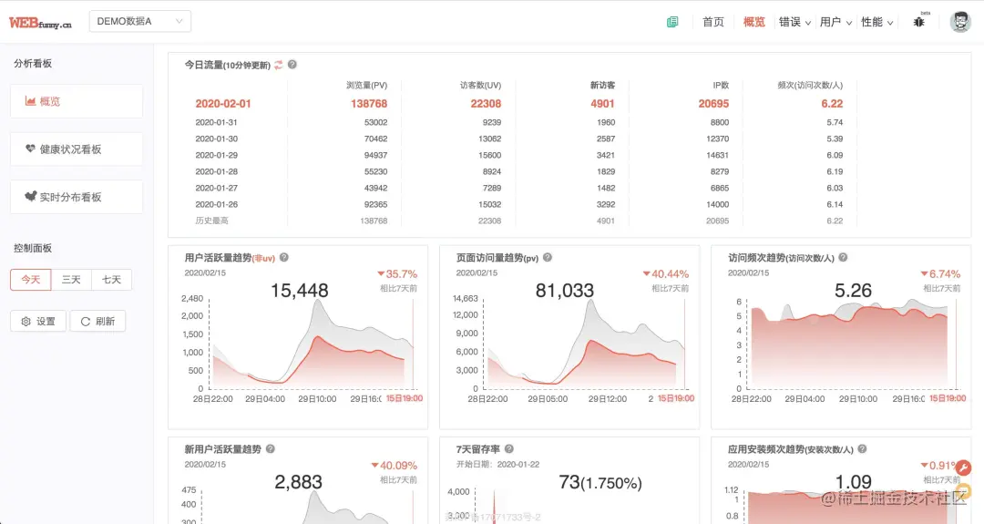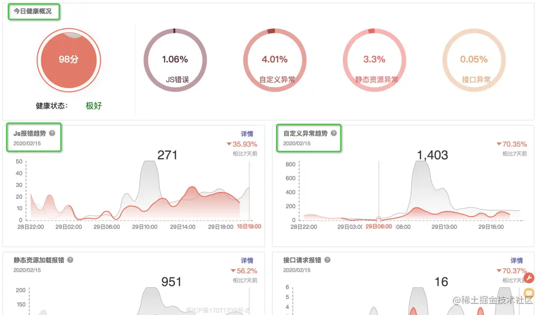 首先,我们需要有个报错趋势总览的功能,我们不是机器,不可能一直盯着我们的数据,看看产生了多少错误,所以我们需要一个趋势图。报错趋势图中添加了对7天前,同一时间段的数据做了对比,可以作为参考。另外,我们还需要一个警报系统,这样,我们就能够实时掌握线上项目的健康状况了。最后,我加了评分功能,辅助我们对项目健康状况的判断。