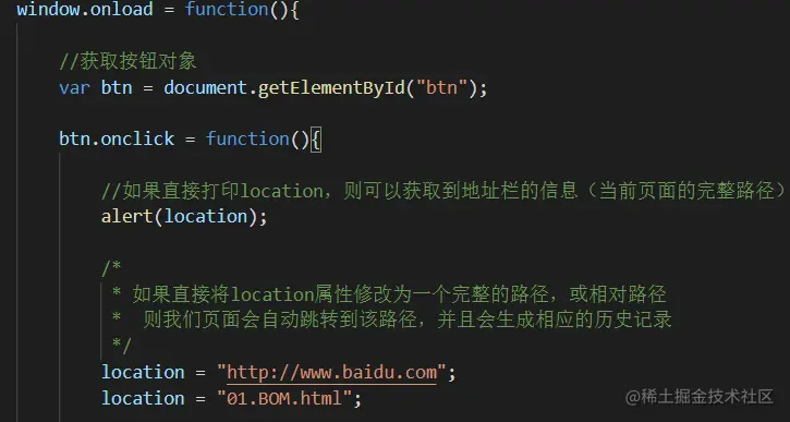 - 如果直接将location属性修改为一个完整的路径,或相对路径,则我们页面会自动跳转到该路径,并且会生成相应的历史记录