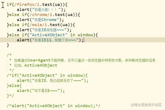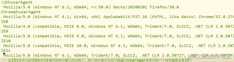 - 在IE11中已经将微软和IE相关的表示都已经去除了,所以我们基本已经不能通过UserAgent来识别一个浏览器是不是IE了