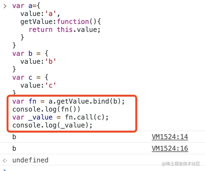 我们可以看到bind之后,无法通过call来再次改变this的指向。我们想要输出c的value,但是却依旧输出的是b的value。为了解决以上问题我们要实现一种软绑定。