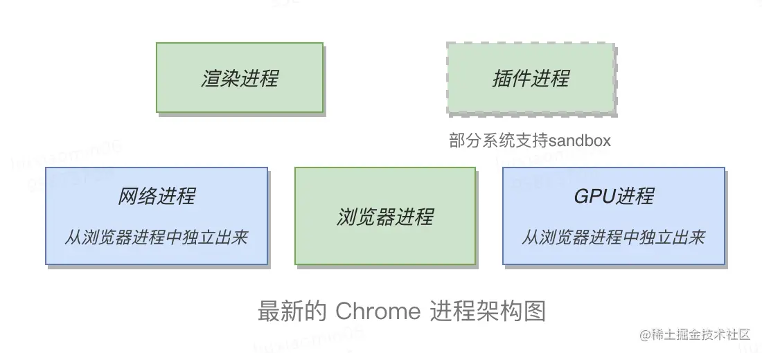 最新的 Chrome 浏览器包括:1 个浏览器(Browser)主进程、1 个 GPU 进程、1 个网络(NetWork)进程、多个渲染进程和多个插件进程。