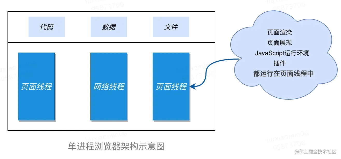 单进程浏览器是指浏览器的所有功能模块都是运行在同一个进程里,这些模块包含了网络、插件、JavaScript 运行环境、渲染引擎和页面等。其实早在 2007 年之前,市面上浏览器都是单进程的。单进程浏览器的架构如下图所示: