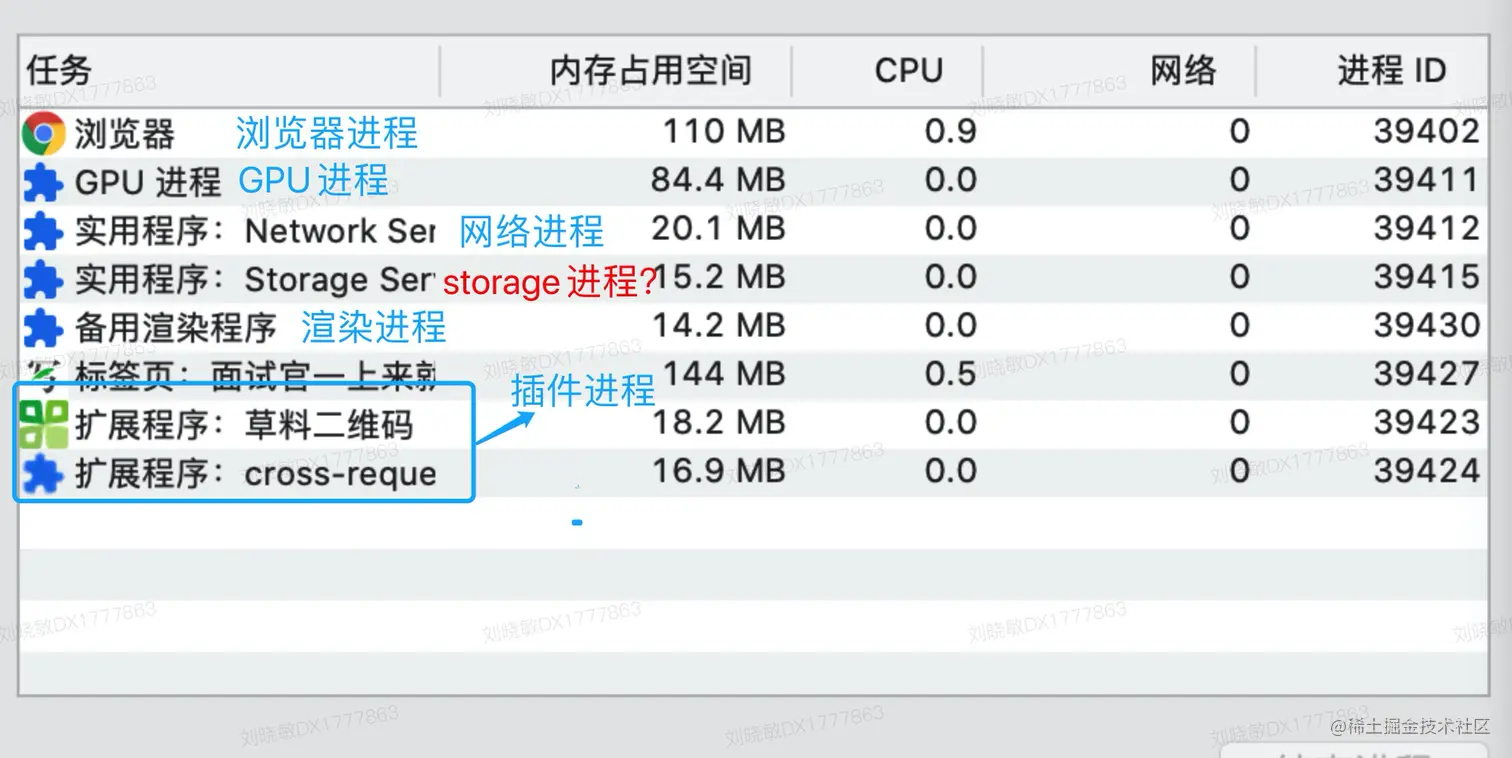 其中插件进程是因为我安装了一些浏览器的插件,其他几个进程包括一个网络进程、一个浏览器进程、一个GPU进程、一个渲染进程,还有一个Storage进程这个应该是最新chrome新增的(没有查到),这些进程都是打开一个页面至少需要的浏览器进程。