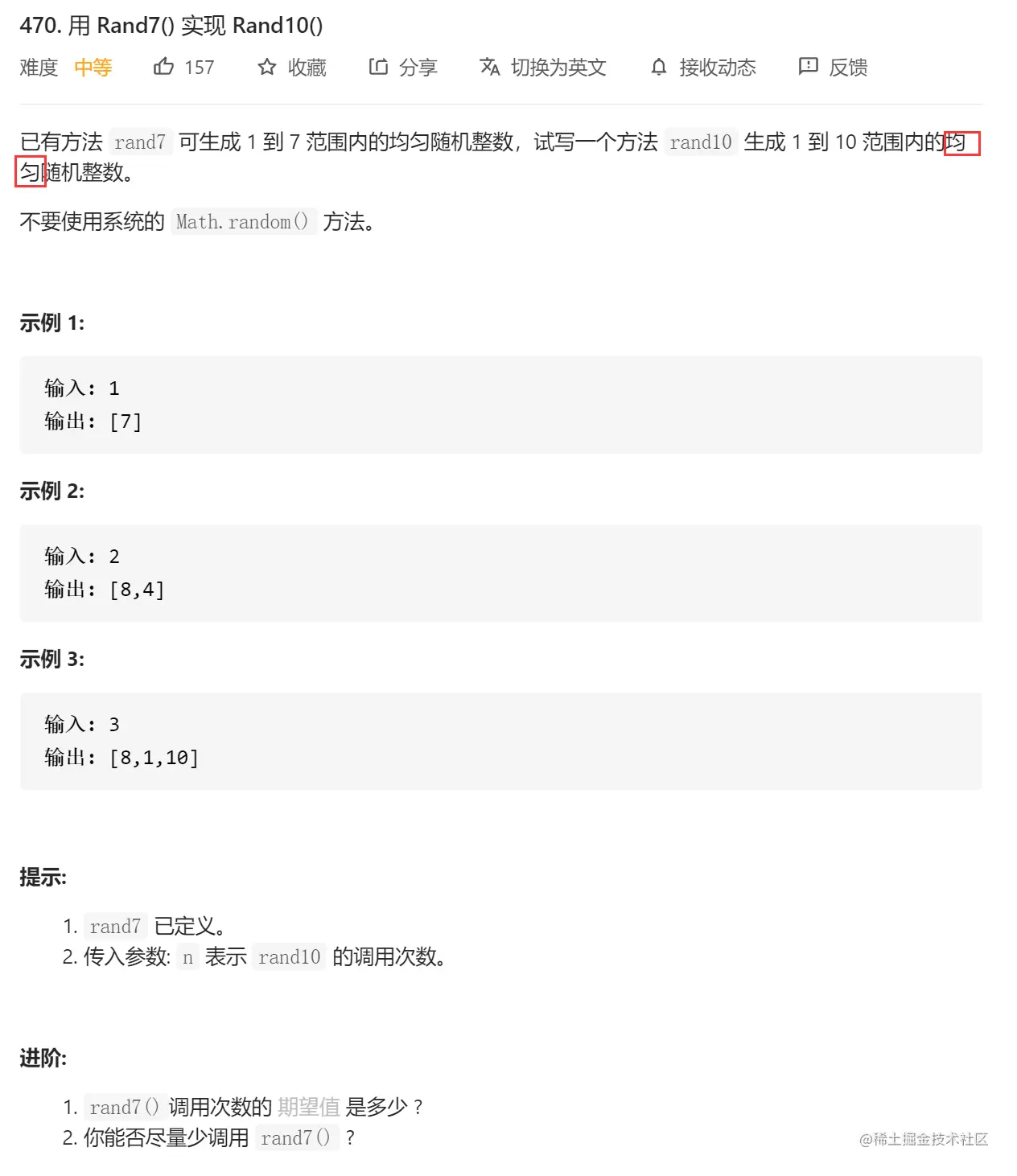 (rand7 - 1)* 7 + rand7可以cover 1~49,并且每个数字出现的概率均为1 / 49.