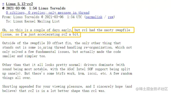 在发现 5.12-rc1 版本存在的交换文件问题后,Linux 几天内就推出了 5.12-rc2 内核版本。