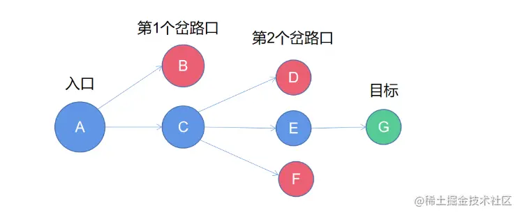 - 遍历B,发现是死胡同,回退到最近的分岔口A,尝试往C方向走;