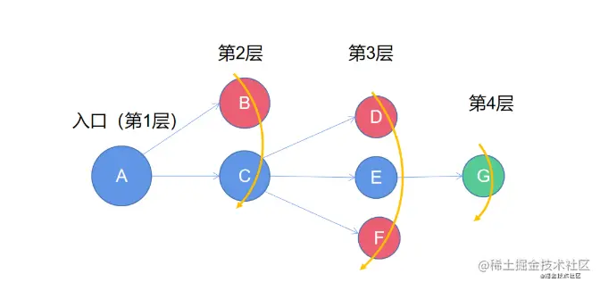 - 遍历第2层数据,访问A,有B和C两条路,保存为下一层的遍历数据,清空A数据。