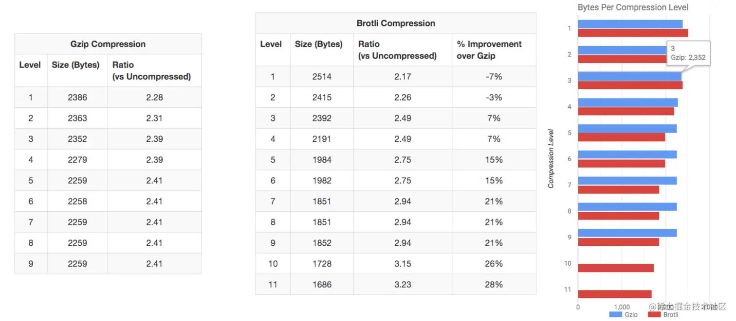下图是针对京东首页启用 Brotli 压缩对比 Gzip 的压缩比的情况,在 5 级压缩以上,Brotli 明显好于 Gzip。(参考:tools.paulcalvano.com/compression…